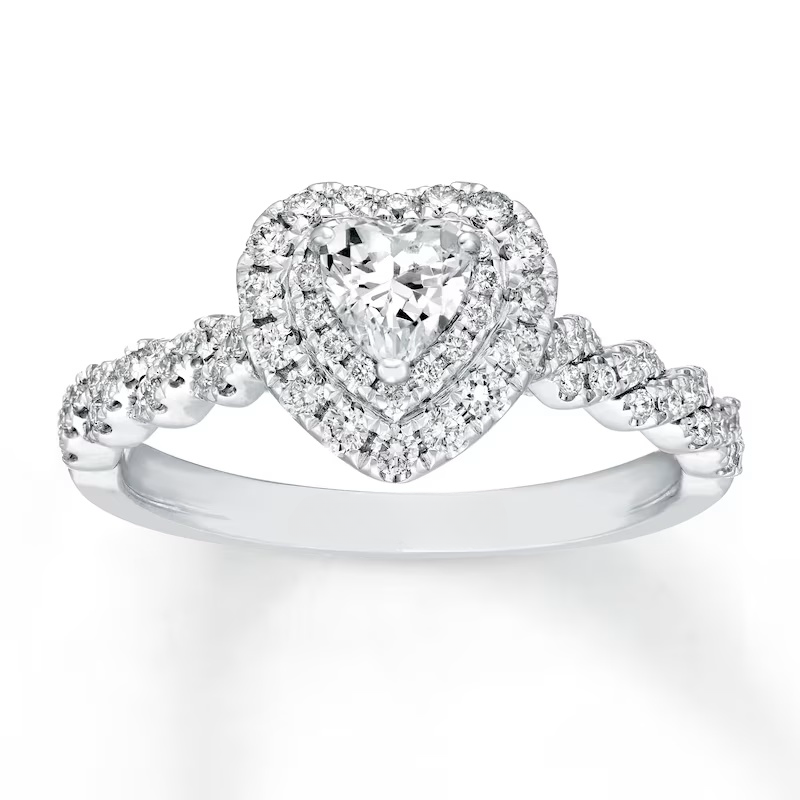 A gorgeous symbol of your love, this sparkling bridal set from features an engagement ring with a romantic heart-shaped diamond haloed by glimmering round diamonds. The band and matching wedding ring are adorned with twists of round diamonds, bringing the total weight of the set to 7/8 carat. The ring is styled in 14K white gold.