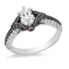 - Two rows of shimmering diamonds along the shank and two bezel-set bright red rubies under the gallery decorate this epic design.